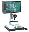 Průmyslový mikroskop s 20,5 MPix IDS barevnou digitální kamerou, 4x digitální zoom, 25 mm objektivem Megapixel TAMRON. Kompletní sestava včetně monitoru a mini-PC. Monitor je umístěn přímo na sestavě.