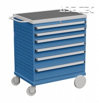 Skříňka se zásuvkami opatřená kolečky se hodí jako univerzální vozík na nářadí, součástky a jiné drobné předměty. Rozměry 710 x 480 x 875 mm, max. nosnost 300 kg, zásuvky 5 x 75, 1 x 100, 1 x 125 mm.
