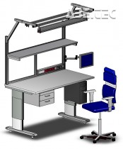 Výšku polohy stolu lze přizpůsobit elektromotorem od 700 do 1100 mm. Nastavená rychlost posunu je 19 sekund od minima do maxima. Systém nastavení na obou stranách pomocí hliníkových profilů. Plochy stolu jsou z 26 mm silného antistatického/ESD laminátu, nastavitelné nožičky poskytují jemné přizpůsobení roviny stolu. Uzemnění přes ochranný 1 megaohmový rezistor. Možnost měnit nohy za kolečka. Standartním vybavením je kabelová schránka.