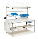 - Pracovní stůl navržený pro použití v moderním výrobním či montážním prostředí.