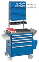 - Průmyslový vozík se zásuvkami a gumovou podložkou.