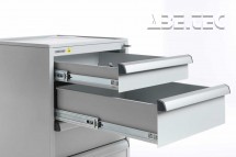 Centrálně uzamykatelké zásuvkové jednotky z vysoce kvalitní oceli nabízí prostor pro skladování nástrojů a malých součástek. Montují se pomocí držáků pod desku stolu. K dispozici jsou také verze s kolečky či soklem. Zásuvkové skříňky jsou pokryty epoxidovou ochrannou vrstvou (šedá, RAL 7035), centrálním zamykáním a úchytkou z anodizovaného hliníků po celé šířce zásuvky.